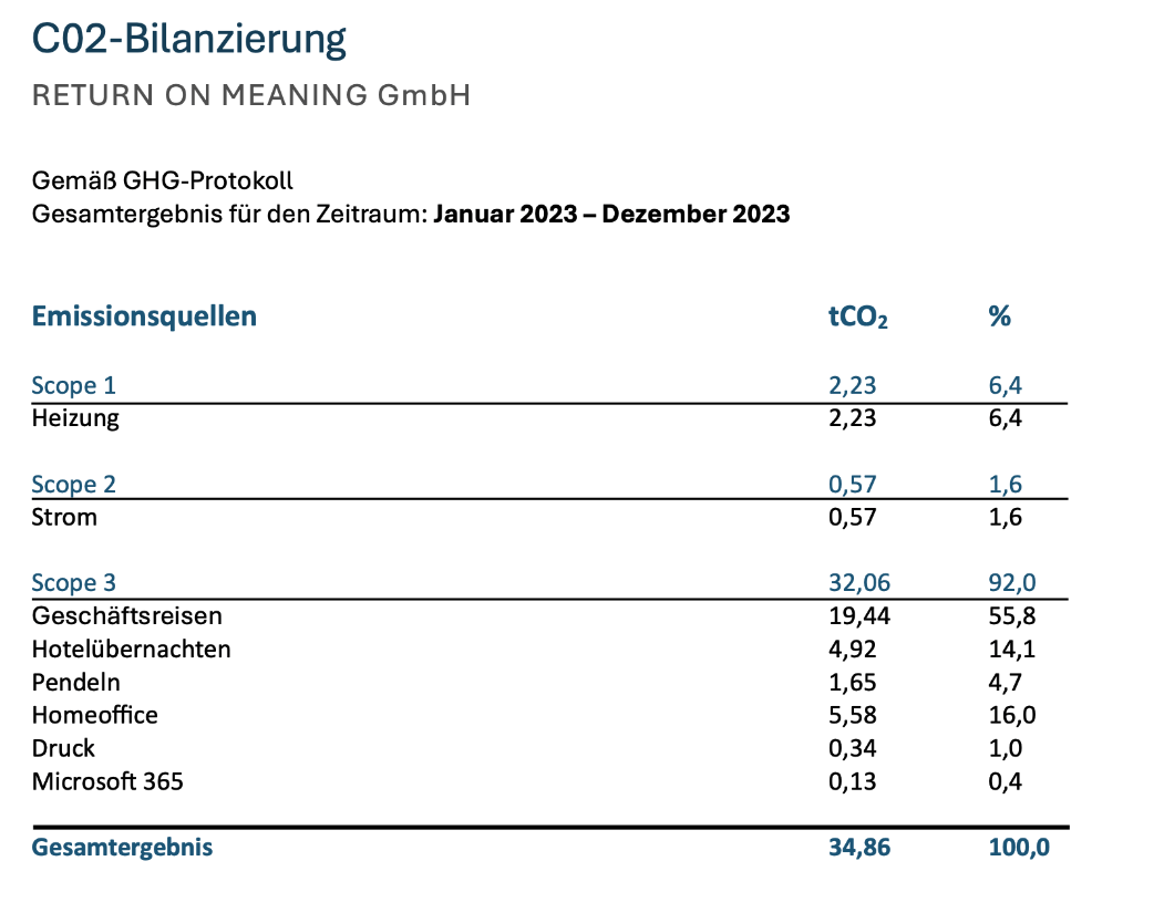 RETURN ON MEANING hat erstmals für das Jahr 2023 eine CO₂-Bilanz erstellt. Seitdem führen wir die Bilanzierung jährlich fort und entwickeln unseren Ansatz kontinuierlich weiter.