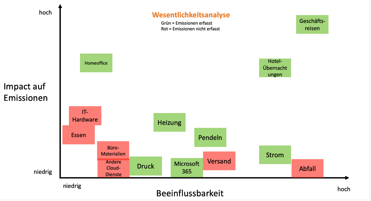 In unserer Wesentlichkeitsanalyse haben wir daher verschiedene Emissionsquellen nach ihrer Beeinflussbarkeit und ihrem Impact auf unser Gesamtergebnis sortiert. Gleichzeitig haben wir farblich markiert, welche Quellen wir bereits erfassen und welche wir bewusst nicht erfasst haben.
